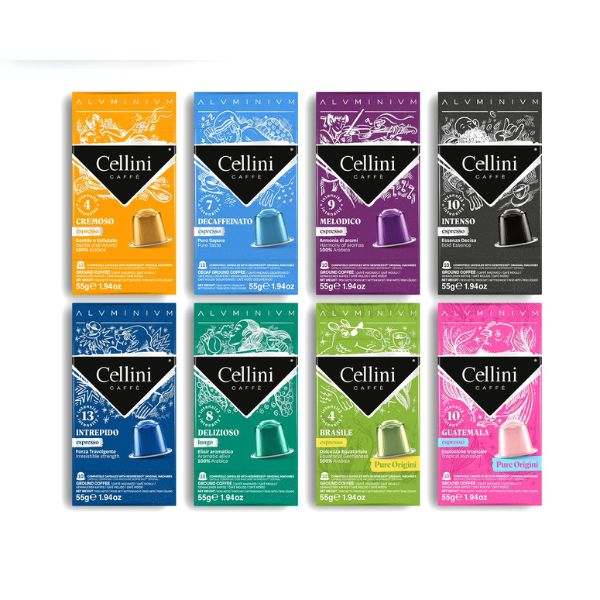 Cápsulas diseñadas para sistemas Nespresso® que permiten disfrutar del espresso italiano de Cellini con comodidad y consistencia en casa u oficina.